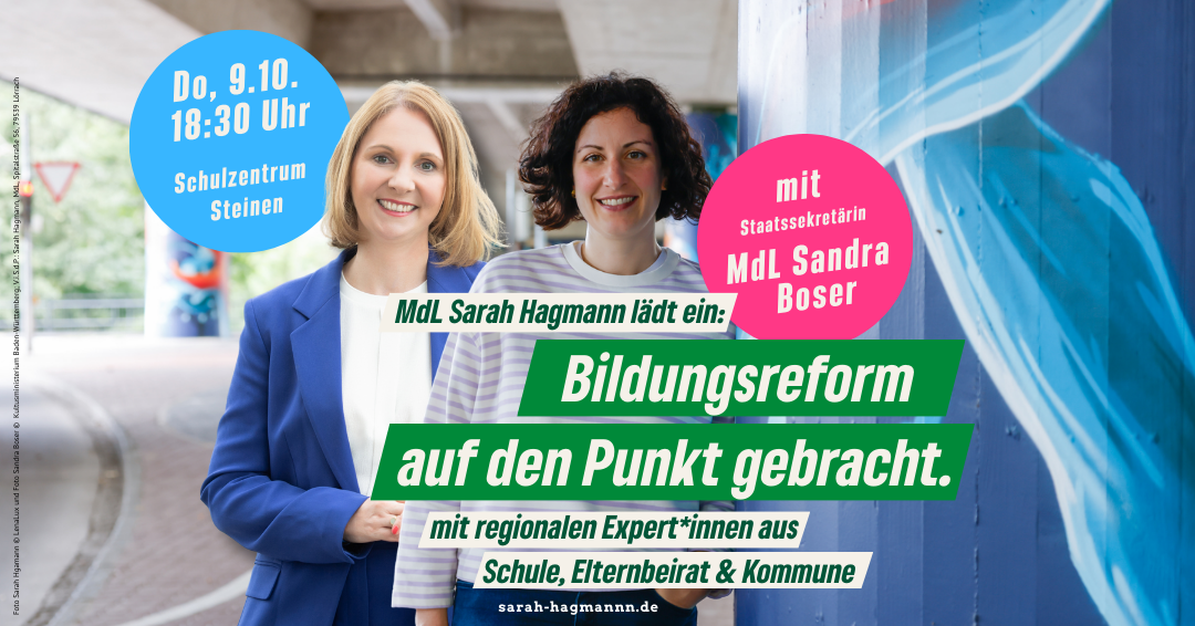 Ich lade zum Podiumsgespräch mit Staatssekretärin Sandra Boser, MdL, ein.