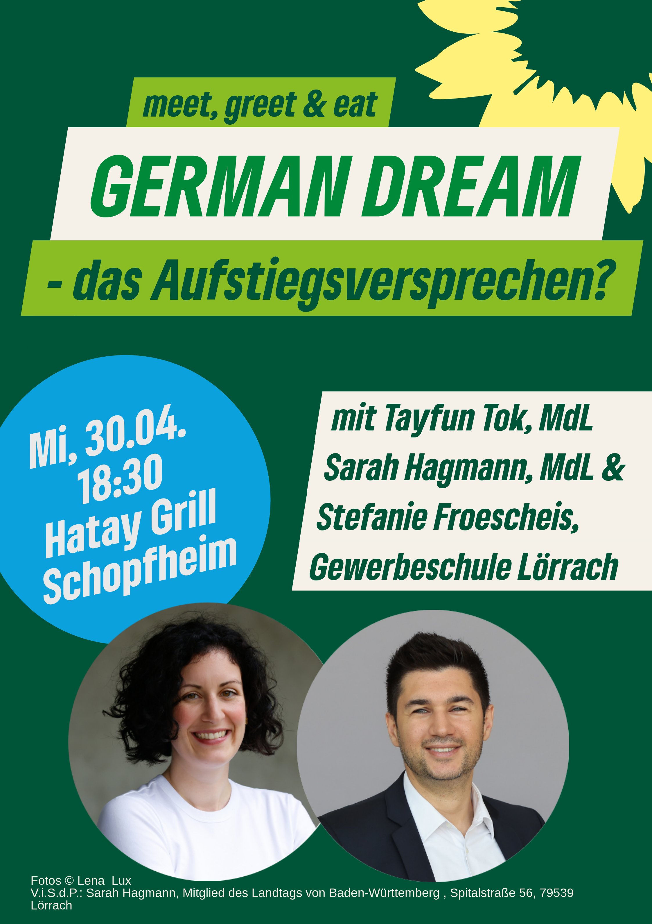 Der Eintritt ist frei und wir laden herzlich zu einem kleinen Imbiss ein. Wir freuen uns, Euch zu dieser besonderen Veranstaltung begrüßen zu dürfen. Lasst uns gemeinsam diskutieren, wie wir den „German Dream“ wieder für alle greifbar machen können - für eine gerechte und zukunftsfähige Gesellschaft.