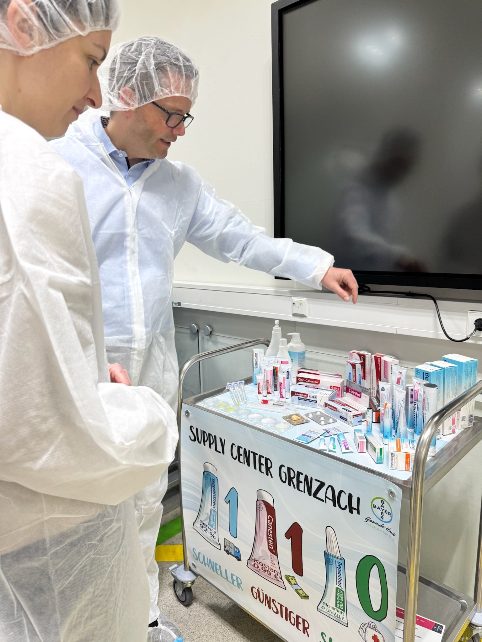 Bei Bayer in Grenzach sind rund 550 Mitarbeiter*innen mit der Herstellung und der Verpackung von Salben für die Verbrauchergesundheit beschäftigt. Pro Tag verlassen rund 600.000 Packungen mit verschiedenen Salben, Cremes und Lotionen das Werk, die weltweit vertrieben werden.